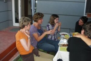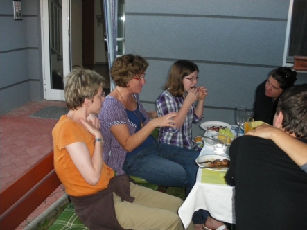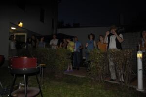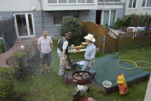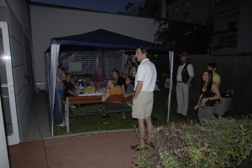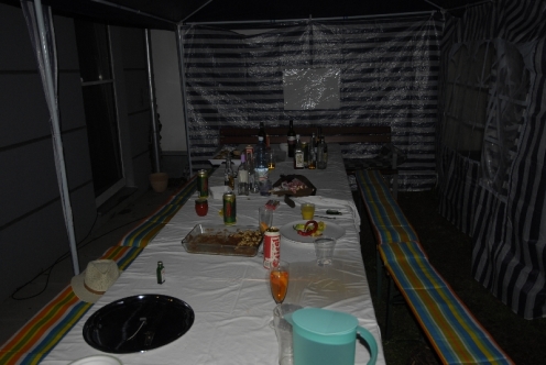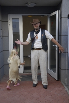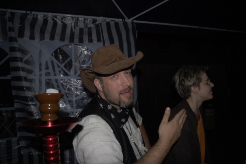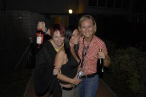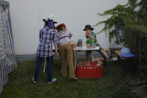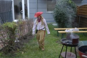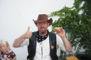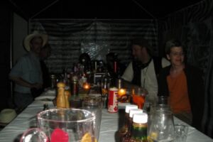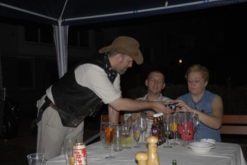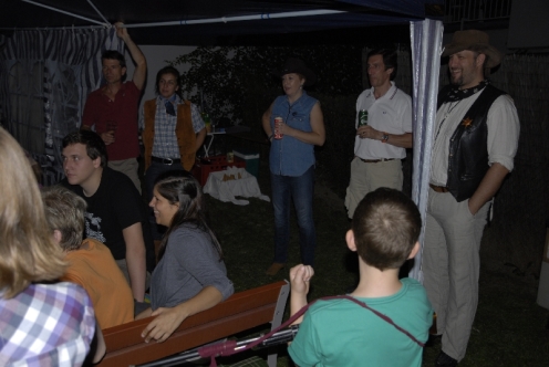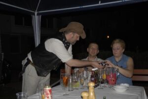 Das Wetter war diesmal einfach spitze! In der Woche zuvor hatten wir noch gegrübelt, wie wir es anstellen würden, sollte der Herbst in seinem vollen Umfang über uns hereinbrechen. Eines war jedenfalls klar, nachdem Liz Mary und ich uns auf ein ‚Packerl‘ geschmissen hatten, um ein Wild West-Fest daraus zu machen, wussten zumindest die meisten was sie anziehen würden. Größtenteils wurde der Vorschlag gerne angenommen. Die Kleiderfrage wiederum wurde jedoch zu einem wahren Problem, weil die Temperaturen am Festtag über 25 °C lagen. Hitze bis spät in die Nacht hinein. Infolgedessen beschlossen einige Outlaws nicht im Cowboy-Look zu erscheinen. Der Sheriff (Arizona-Bob) und Texas Agi (meine Wenigkeit) machten allerdings Druck, dem sich bis auf zwei niemand zu widersetzen wagte. Selbst die hartnäckige Red Babette entschloss sich dazu, im Laufe des Abends mitzuspielen. Bad Boy Mike und Whisky-Pete wehrten sich unermüdlich, bis Pete die Chance bekam, mit dem Texasranger Agi Whisky zu trinken. Dadurch entschloss er sich dazu, zumindest in ein Hemd zu schlüpfen, um möglichst den Schein zu wahren. Eigentlich wollte Sheriff Bob den Bad Boy einsperren, von dem er allerdings Abstand nahm, weil dieser in Begleitung von Calamity-Chrissie kam. Diese ist sehr berüchtigt. Glück für den Bad Boy. Sonst wäre er fällig gewesen. Sheriff Bob kennt normalerweise keine Gnade.