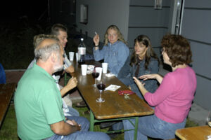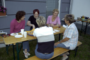 Auf den Buffet-Tischen war irgendwann kein Platz mehr, und so stellten wir noch ein paar kleine Campingtische auf. Mit dieser Menge an Speisen und Getränken hätten wir auch noch am nächsten Tag weiter feiern können, und es bliebe wahrscheinlich noch immer etwas übrig. Ein kleiner Auszug aus unserer Speisekarte: Gebackene Hühnerkeulen, Fleischlaibchen mit Erdäpfelsalat, Grammelpogatschen, Schinkenkipferl, ein gefülltes Brezel mit ca. 50 cm Durchmesser(!), Tramezzini, Letscho, Nudelsalate, Aufstriche, Brot und Gebäck, Tiramisu, Bananenschnitte, Marillenkuchen, und noch jede Menge anderer Leckereien. Und über Durst konnte sich auch niemand beklagen. Es wurde gegessen, getrunken, getratscht, gescherzt. Geschichten über Umzug, Einrichtung, kleine oder größere Probleme im Haus wurden besprochen. Also alles was in diesem ersten Jahr so passierte. Man lernte seine Nachbarn ein wenig besser kennen. Und so nebenbei wurde mit dem Gedanken an eine eigene Webseite für unser Haus gespielt. Und irgendwann, weit nach Mitternacht löste sich dann auch die letzte Gruppe auf. Zurück bleiben die Gedanken an einen sehr netten, gemütlichen Abend in unserem kleinen Gemeinschaftsgarten.