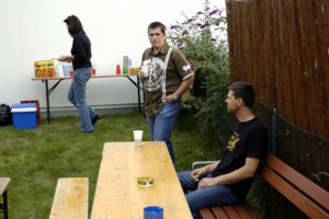Dann war endlich der 25. August. Und am Morgen regnete es! Die Aussichten waren also nicht so berauschend, denn eine Gartenparty in der Garage ist ja auch nicht so toll. Doch bis Mittag hörte der Regen auf. Und wir einigten uns darauf, es trotzdem im Garten zu riskieren. Ein paar Leute begannen dann um 16 Uhr die Tische und Bänke zu holen und aufzustellen. Die ersten Mitbewohner gesellten sich dann auch dazu und die eine oder andere Flasche wurde schon geleert.