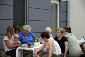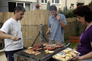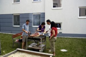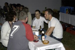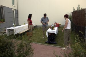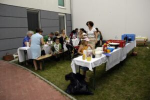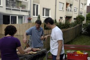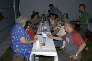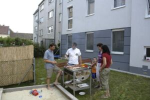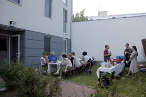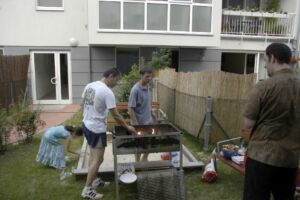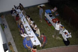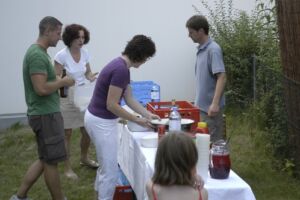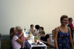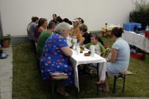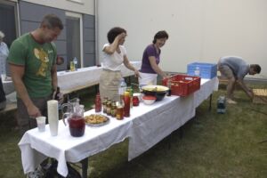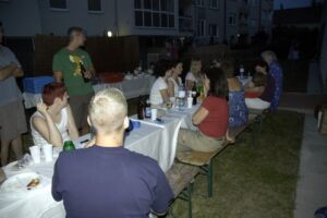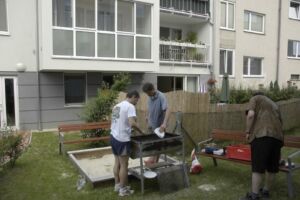 Trotz des vielleicht etwas ungünstig gewählten Termins am Pfingstwochenende fand sich fast die Hälfte der Bewohner ein. Der Großteil kam wieder von Stiege 2. Hoffentlich wird das bei der 2-Jahres-Feier (gleich vormerken: 25. August!) einmal anders. Die Ehre von Stiege 1 hielten Doris (die ja immer brav dabei ist), Fam. Akkus und sogar unser neuer Mitbewohner von 1/10 hoch.